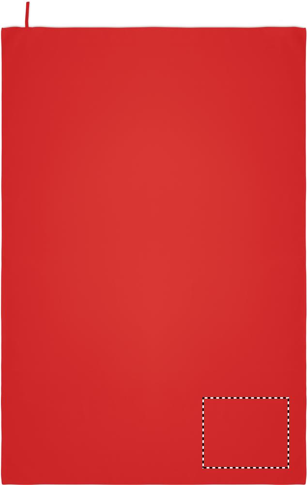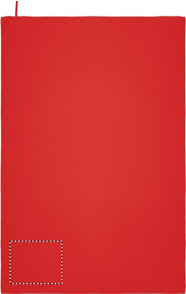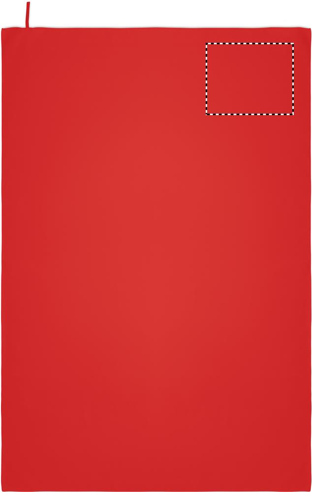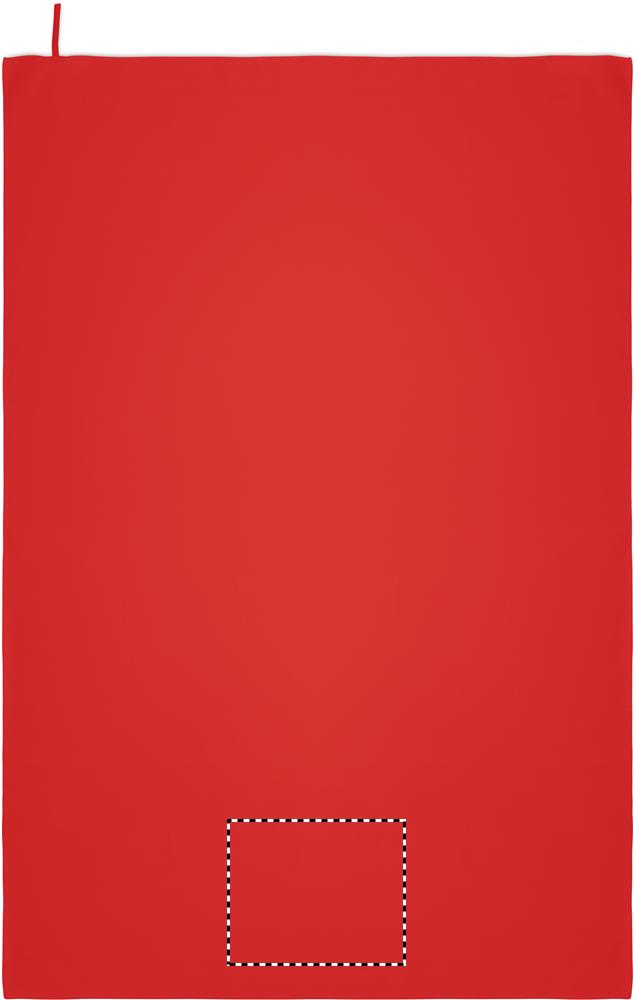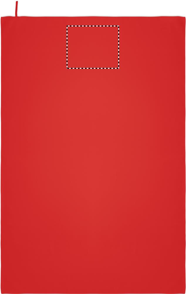 Handtuch aus Mikrofaser. 90% Polyester und 10% Polyamid mit Elastikschlaufe. Leicht und schnell trocknend. Maße: 100 x 150 cm.
