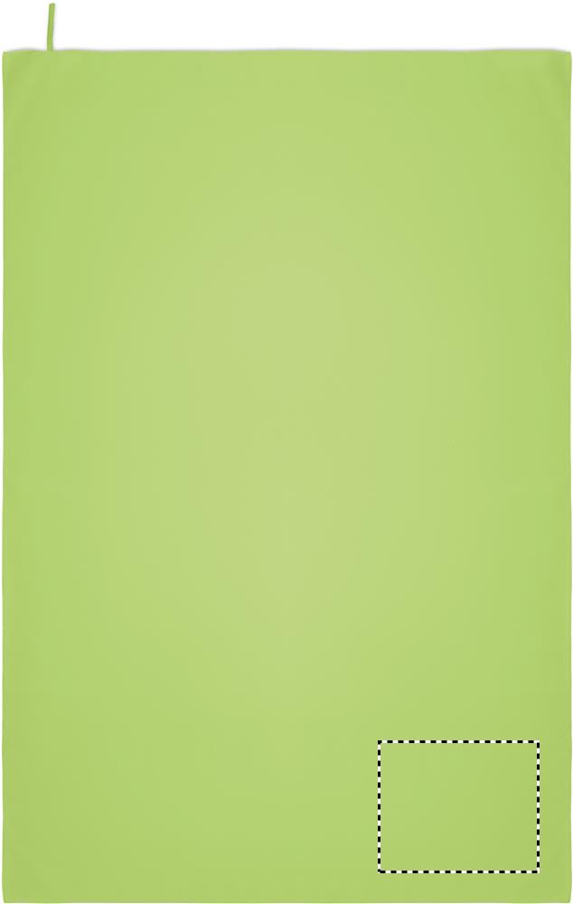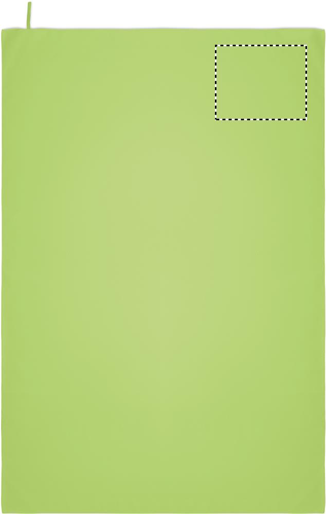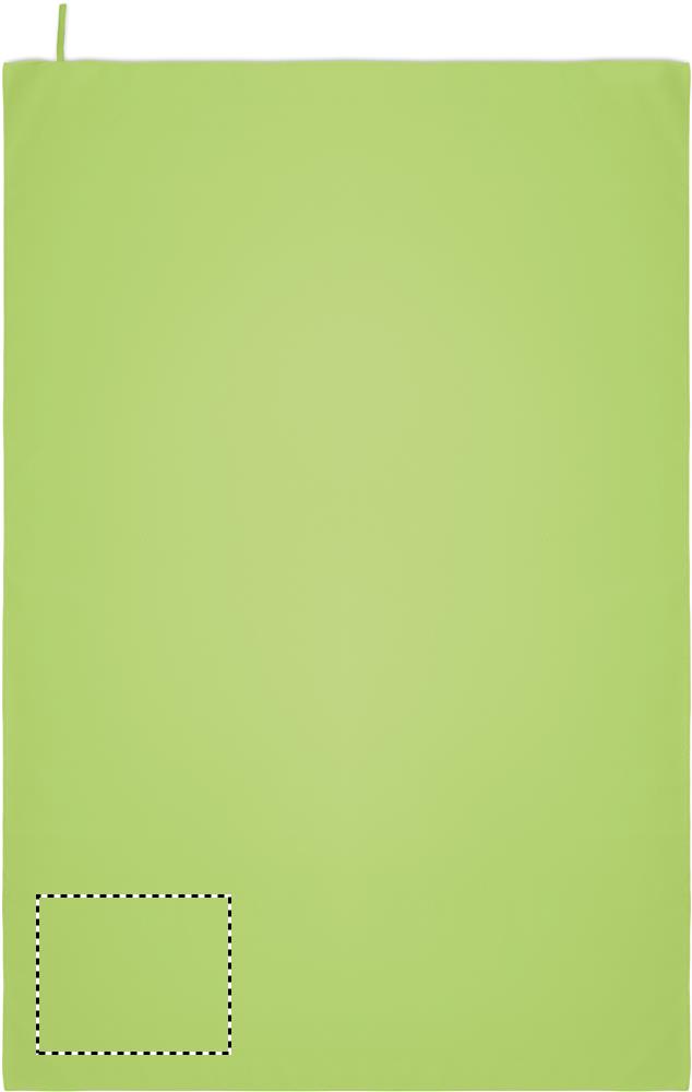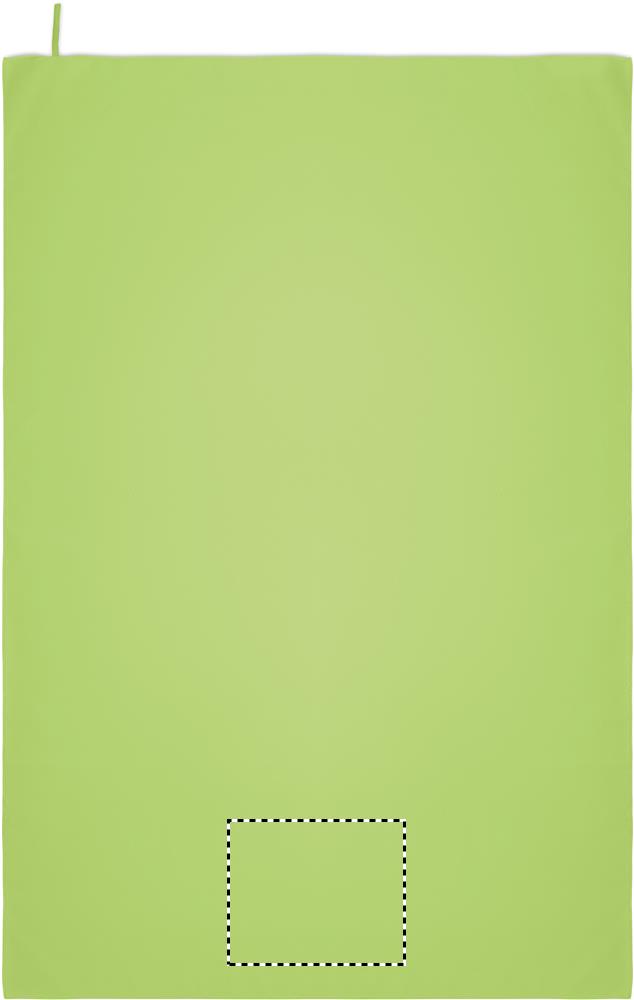 Handtuch aus Mikrofaser. 90% Polyester und 10% Polyamid mit Elastikschlaufe. Leicht und schnell trocknend. Maße: 100 x 150 cm.