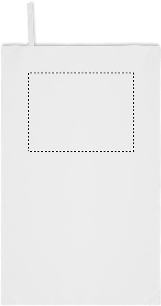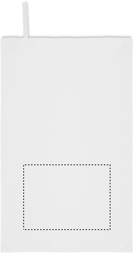 Handtuch aus Mikrofaser. 90% Polyester und 10% Polyamid mit Elastikschlaufe. Leicht und schnell trocknend. Maße: 30 x 50 cm.