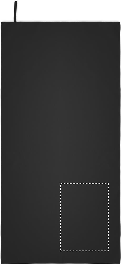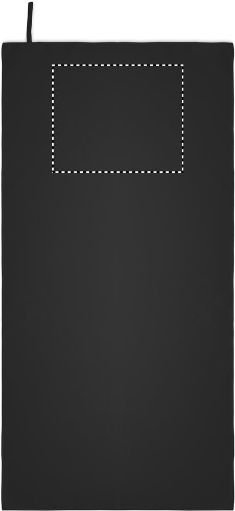 Handtuch aus Mikrofaser. 90% Polyester und 10% Polyamid mit Elastikschlaufe. Leicht und schnell trocknend. Maße: 50 x 100 cm.
