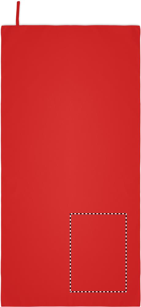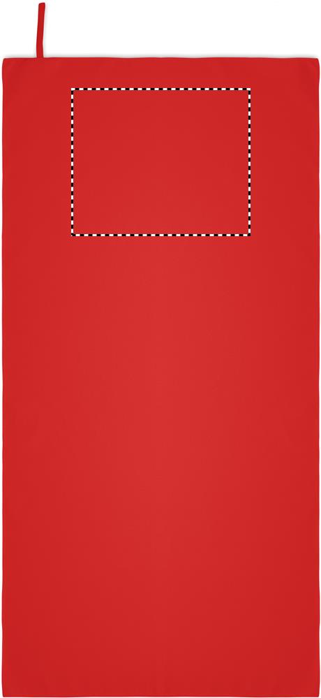 Handtuch aus Mikrofaser. 90% Polyester und 10% Polyamid mit Elastikschlaufe. Leicht und schnell trocknend. Maße: 50 x 100 cm.