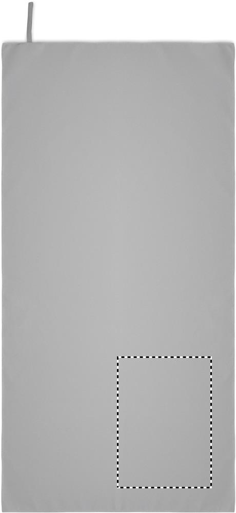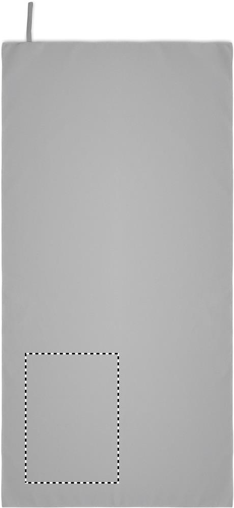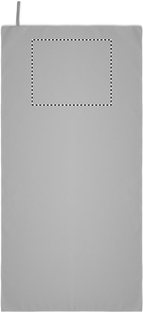 Handtuch aus Mikrofaser. 90% Polyester und 10% Polyamid mit Elastikschlaufe. Leicht und schnell trocknend. Maße: 50 x 100 cm.