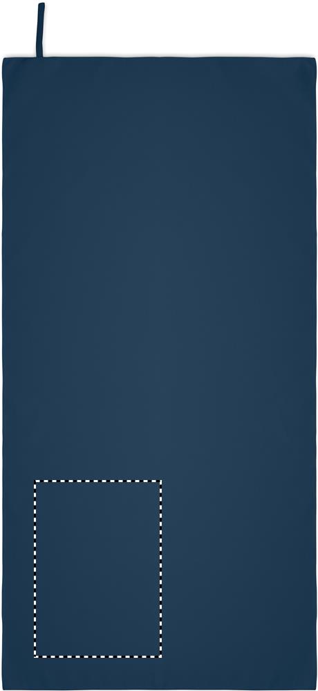 Handtuch aus Mikrofaser. 90% Polyester und 10% Polyamid mit Elastikschlaufe. Leicht und schnell trocknend. Maße: 50 x 100 cm.