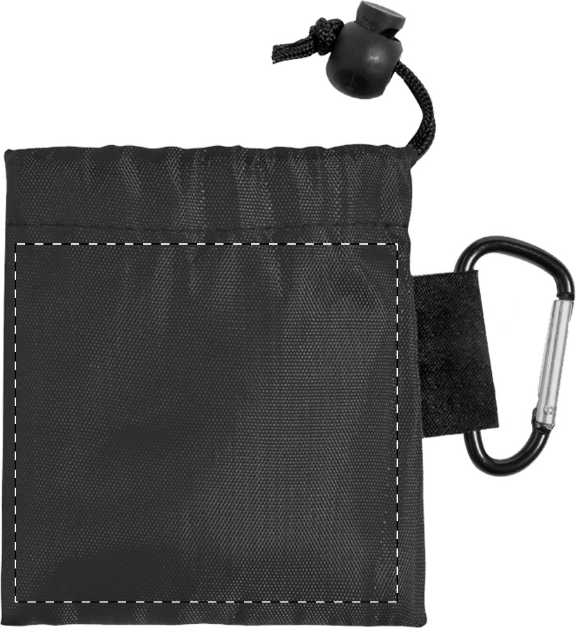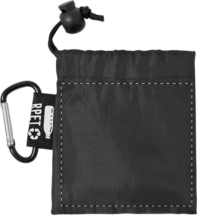 Transparenter Poncho aus LDPE in Einheitsgröße für Erwachsene. In RPET-Polyester-Tragetasche, mit Aluminiumkarabiner. Mit RPET-Label.