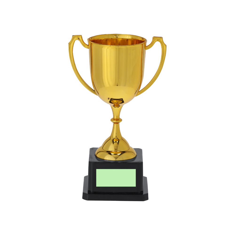 Trophäe mit elegantem glänzendem Finish in Gold, entworfen mit großen Griffen und einer schwarzen Basis für einen auffälligen Touch.