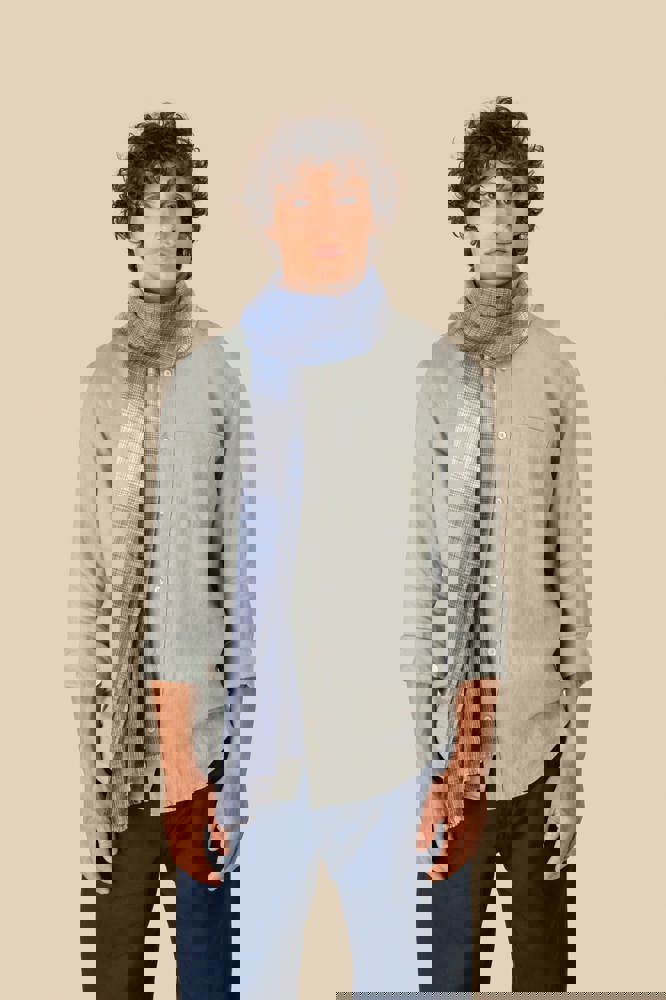 100 % Baumwolle. Gewebtes Schal mit Fransen, verziert mit grafischen Mustern mit feinen blauen und beigen Streifen. Unsere handgewebten Kopftücher können leichte Farbabweichungen von einem Stück zum anderen aufweisen, was ein Zeichen für unsere authentische Handwerkskunst ist.